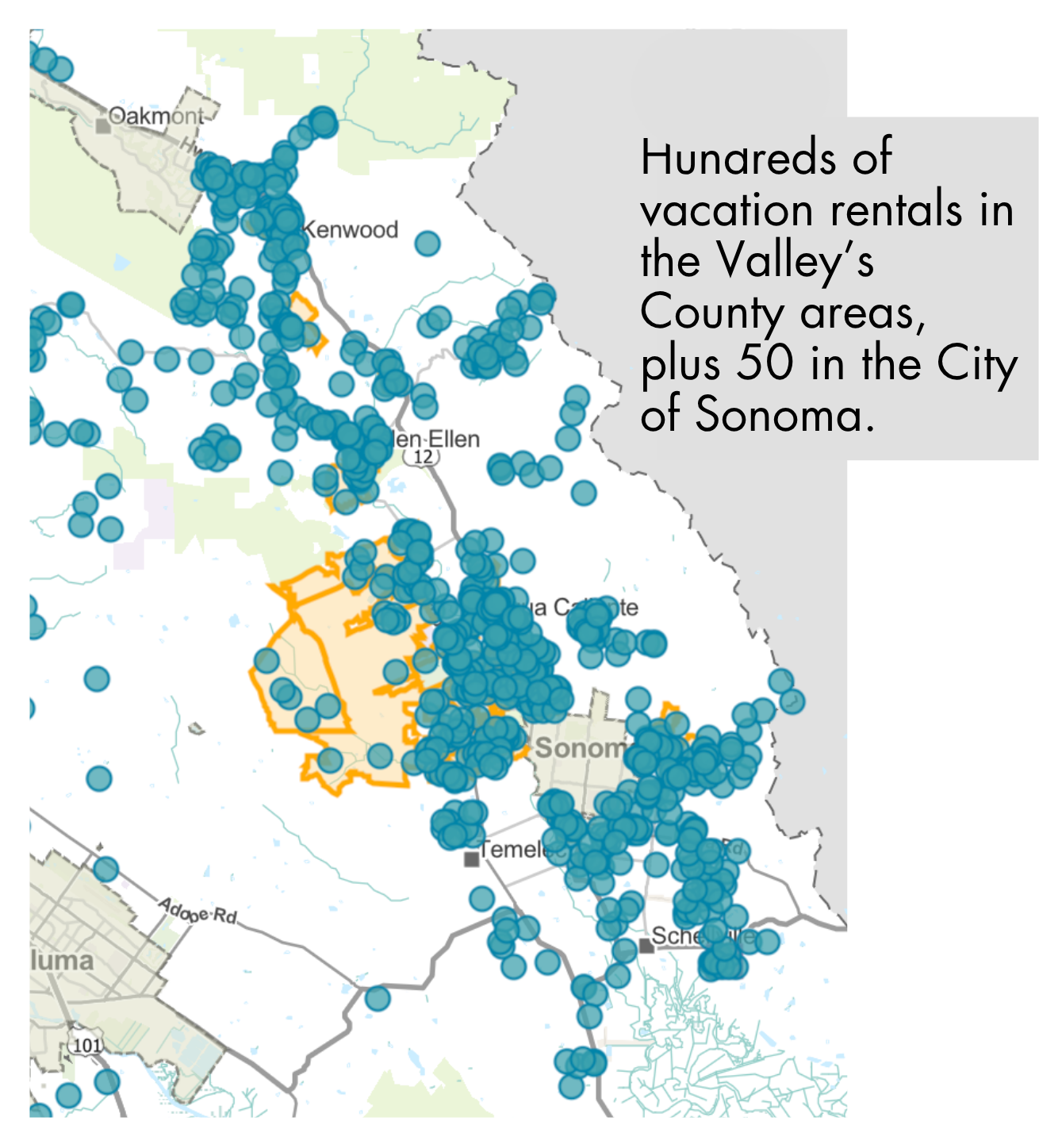 Compared to the rest of Sonoma County, Sonoma Valley has a concentration of vacation rentals.